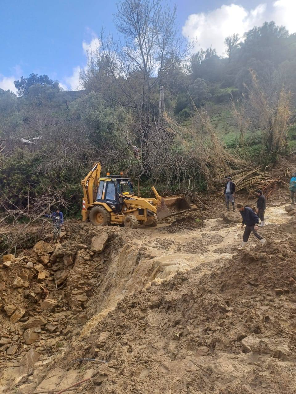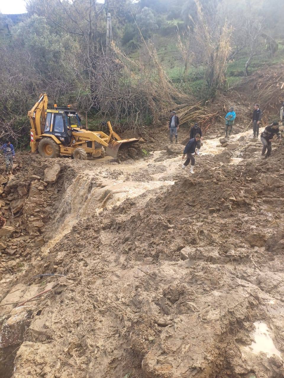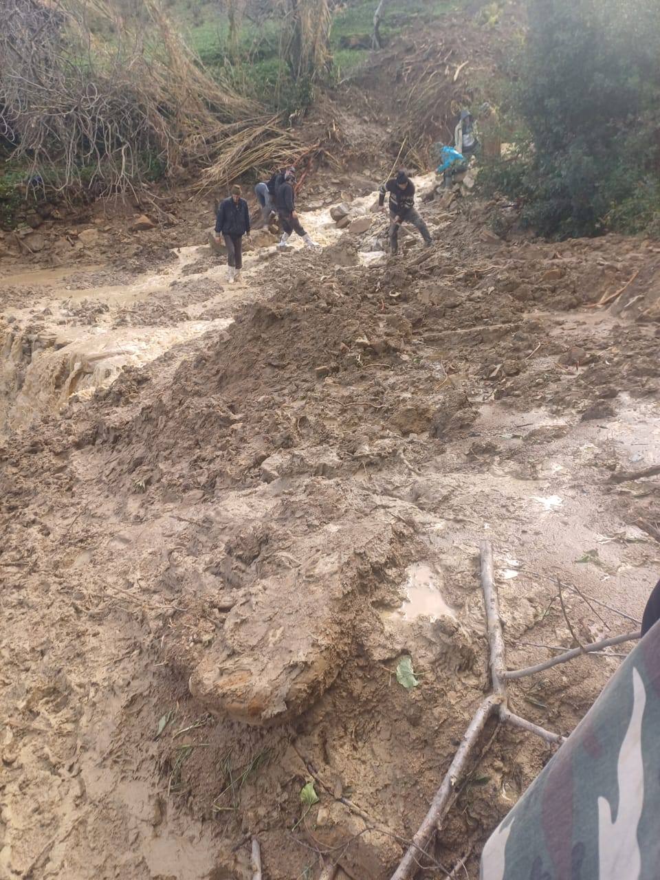 وفي هذا الإطار، تم توثيق صور من تدخل ميداني بطريق الشعرة – دار هيدور، حيث وقف الجميع على صعوبة الوضعية وخطورتها. ورغم محاولة التدخل باستعمال الجرافة، إلا أن الأمر بدا مستحيلاً نظراً لهشاشة التربة وخطورة الانهيارات.